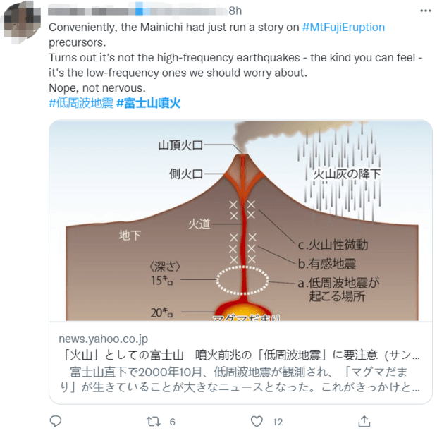 此外,有人提到了日本每日新闻社出版社《经济学家》周刊12月2日发表的文章,文章称“低频地震”是一种缓慢晃动的地震,是人体感觉不到的小地震,但这种低频地震可能是富士山喷发的前兆。