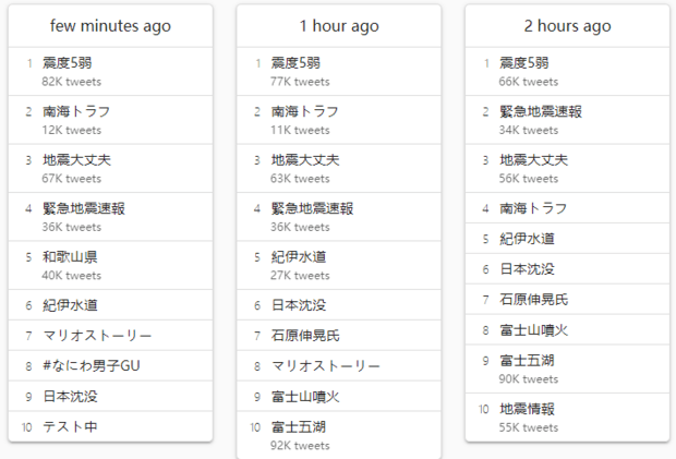 当地时间12月3日上午,推特日本区的热搜前10名几乎被地震相关话题占据,“5级地震”“南海海沟”“日本沉没”“富士山喷火”都是日本网民热议的关键词,对日本南海海沟发生大地震的恐惧再一次蔓延开来。