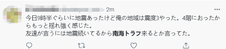 还有人分享自己因为楼层高明显感受到摇晃的经历,称“朋友说地震还在持续,所以南海海沟大地震要来了”。